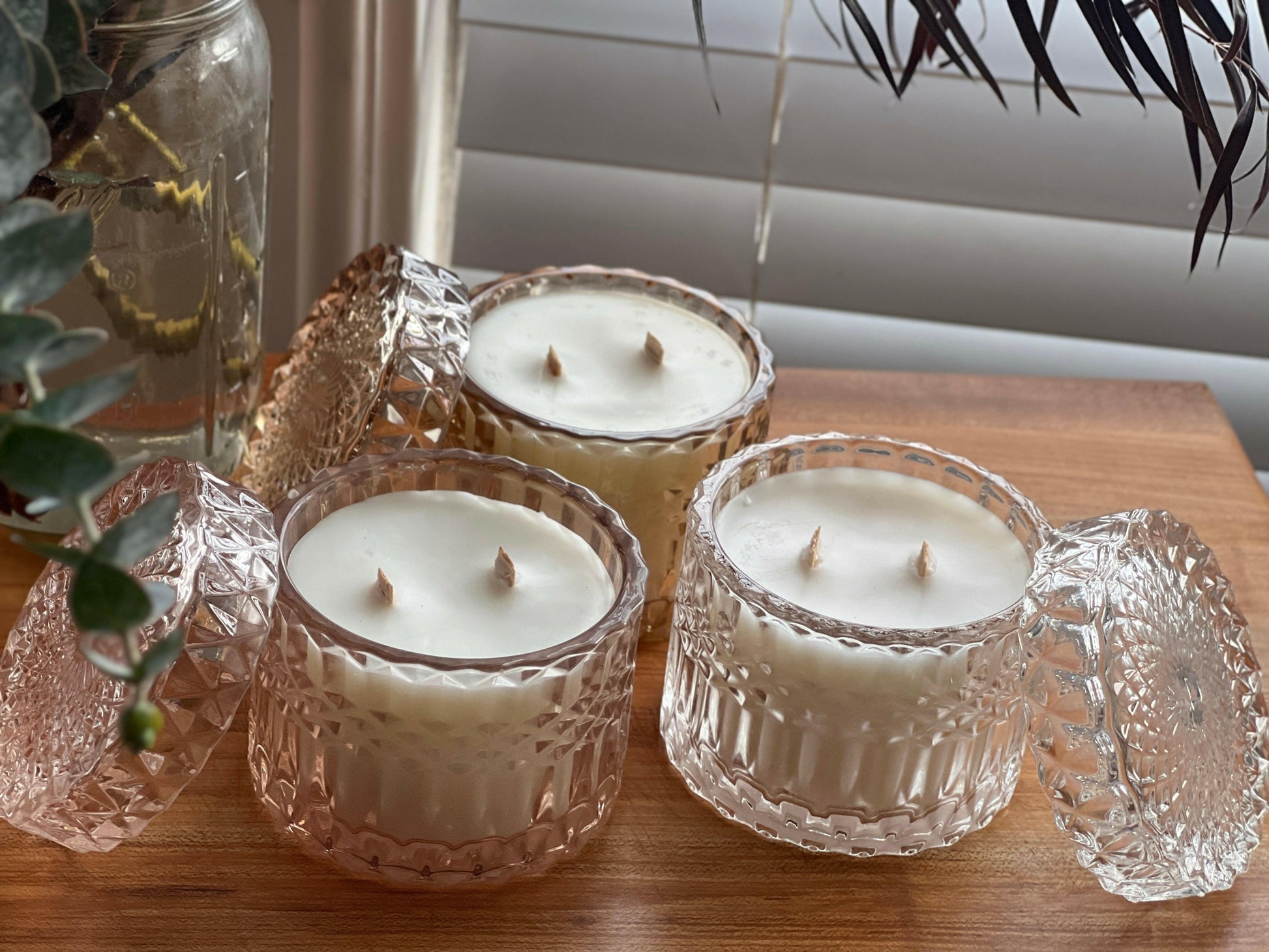 This gorgeous capsule collection showcases three complementary premium fragrances. The 7.0 oz candles are made with coconut apricot wax, and housed in a beautiful glass container with lid. Double wood wicks are anchored in low profile wick holders - expect a long, even burn with a little ambiance!